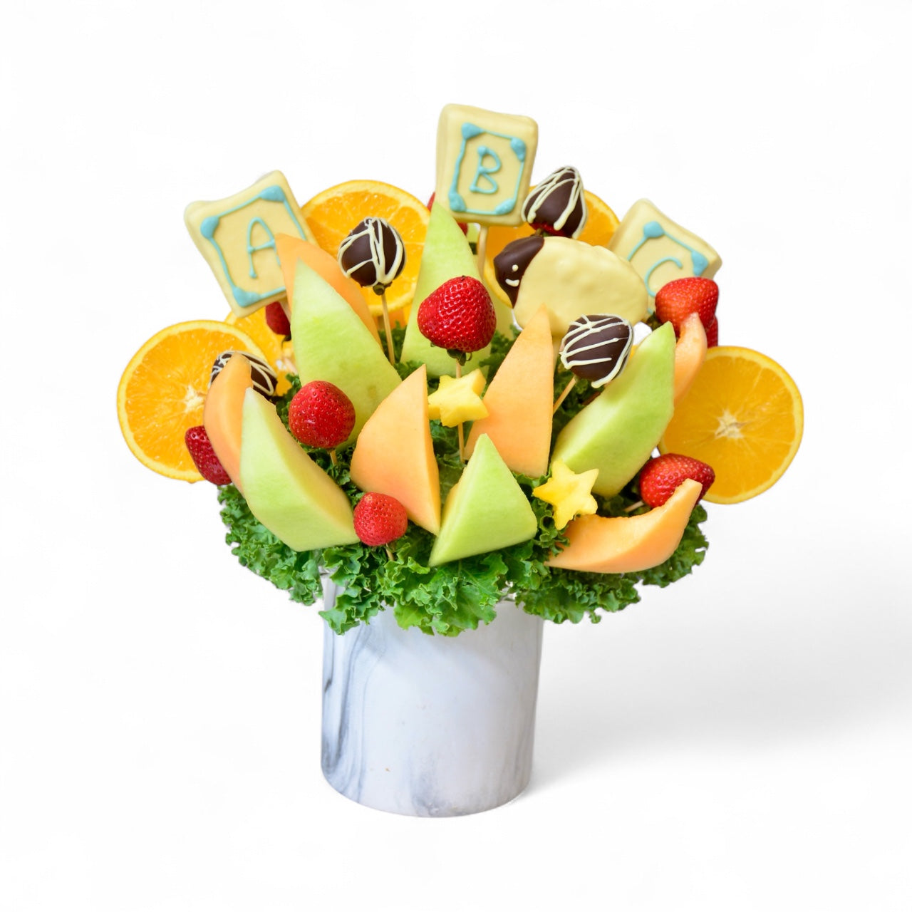 Chocolate Dipped Pineapple Sheep and ABC letters, Mini Pineapple Stars, Chocolate Covered Strawberries with White Chocolate Swirls, Oranges, Cantaloupe, Honeydew, Fresh Strawberries