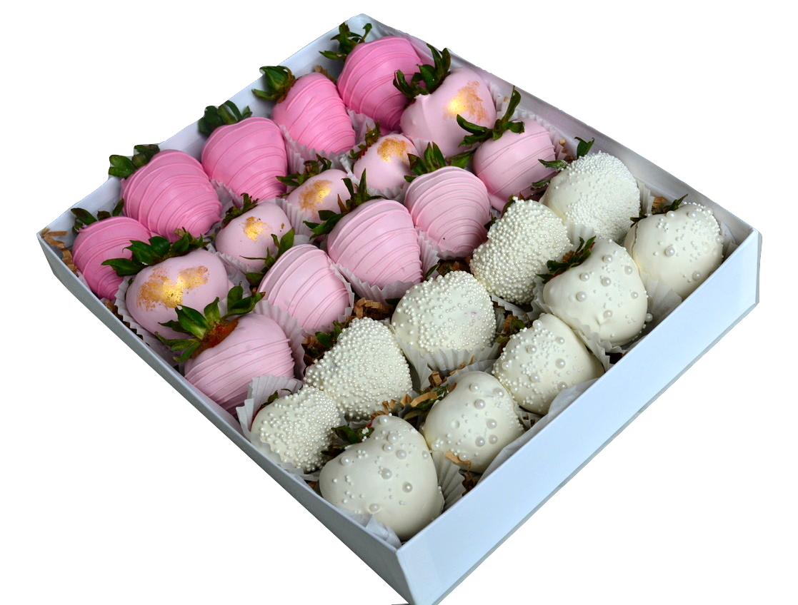 Surprise and delight with this dreamy gift box that is filled with 25 lustrous hand-dipped chocolate covered strawberries. Exquisitely adorned with candy pearls and stripes of edible gold, these white and pink chocolate-covered berries will surely leave a lasting impression. 25/box