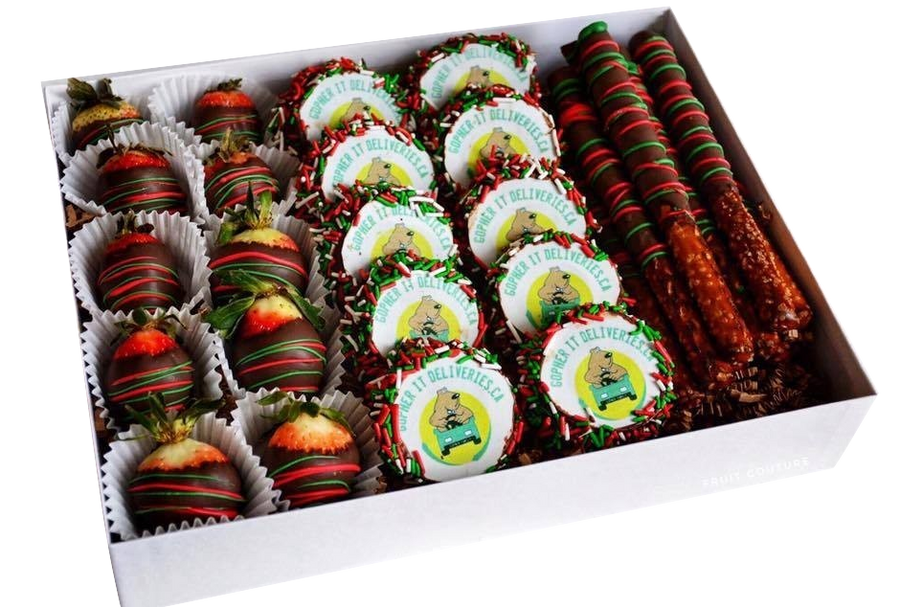 Gift a box of decadent treats with your company logo on it! What better way is there to wish a client or colleague Happy Holidays than with your own branded gift box. Each box includes 10 chocolate covered strawberries and 10 chocolate covered pretzels that are swizzled in festive holiday colours, and 10 chocolate covered Oreos topped with edible images of your logo, with green and red sprinkles! You will need to upload your logo in a JPEG or PNG below.