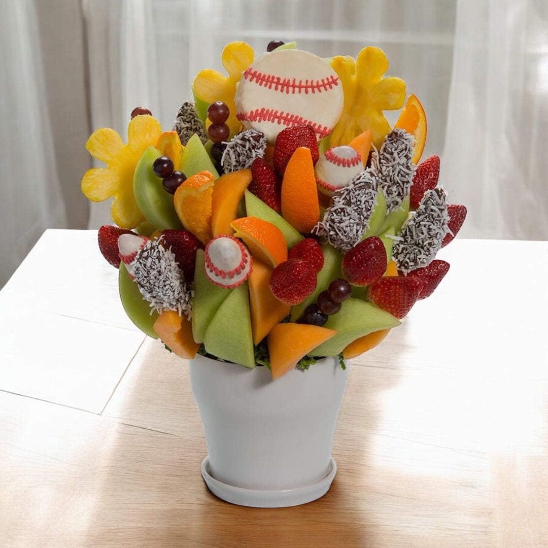 Pineapple Flowers, White Chocolate Covered Pineapple Baseball, White Chocolate Covered Strawberry Baseballs, Fresh Strawberries, Semisweet Dark Belgian Chocolate Covered Apple Wedges, Grapes
